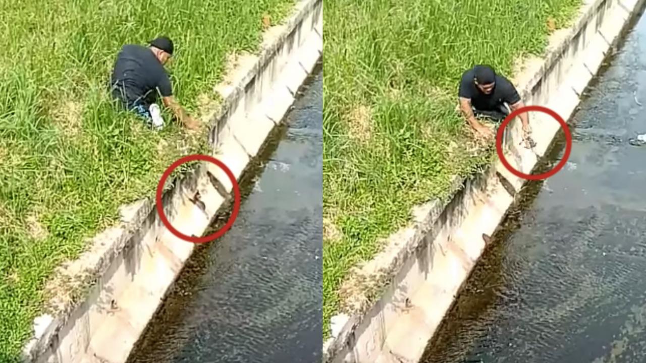 En las imágenes se ve cómo el felino se había caído en el canal y estaba intentando trepar por el muro del mismo sin éxito, cuando el hombre se baja de su silla de ruedas especial y se desliza por una pendiente y con esfuerzo toma al asustado gatito y lo pone en el pasto.