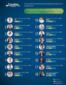 Este ejercicio demoscópico tiene el objetivo de medir cómo son percibidos por la población en honestidad, capacidad e integridad. Para obtener el puesto que ocupa cada uno se realizó el promedio general de estos tres atributos. Los resultados completos, así como la posición de los presidentes municipales por atributos pueden consultarse en www.caudae.com