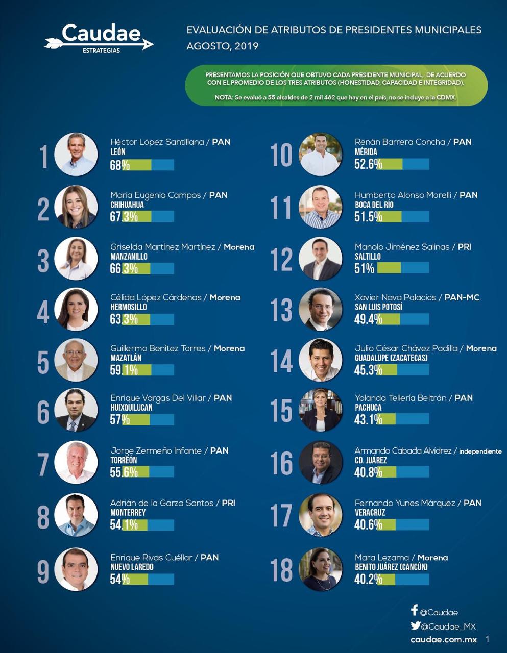Héctor López Santillán, de León; María Eugenia Campos, de Chihuahua; Célida López Cárdenas, de Hermosillo; Griselda Martínez Martínez, de Manzanillo; y Guillermo Benítez Torres, de Mazatlán, son considerados los cinco mejores alcaldes del país, de acuerdo con la Segunda Encuesta de Atributos de Presidentes Municipales, elaborada por Caudae.