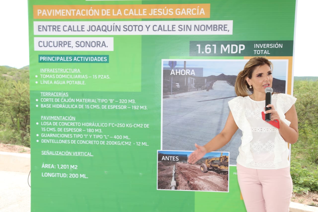 En Cucurpe, la gobernadora Claudia Pavlovich, acompañada de Jesús Miguel Figueroa Ibarra, presidente municipal, entregó la obra de pavimentación con concreto hidráulico de la calle Jesús García, entre Joaquín Soto y Sin nombre, en beneficio de los habitantes de la región.