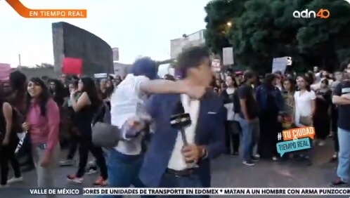“Nosotros estamos transmitiendo únicamente los hechos y la gente ha decidido aventar cosas, ¿por qué? porque están enojadas, sí, una cuestión legítima, sí, porque las mujeres son violentadas en la Ciudad de México y así deciden algunas manifestarse… aventando diamantina a los medios de comunicación”, dijo el comunicador mientras mujeres le arrojaban la brillantina color morado.