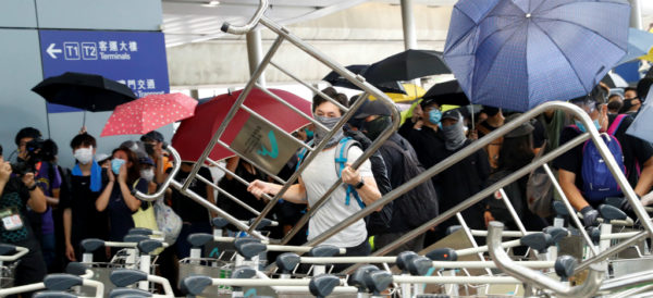 Cientos de manifestantes irrumpieron en la Terminal 1 del Aeropuerto Internacional de Hong Kong causando destrozos en las instalaciones y caos entre los pasajeros, luego de que provocar la suspensión del servicio de trenes hacia la base aérea.