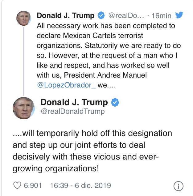 “Se completó todo el trabajo necesario para declarar organizaciones terroristas a los carteles mexicanos. Estatutariamente estamos listos para hacerlo. Sin embargo, a pedido de un hombre que aprecio y respeto, y que ha trabajado tan bien con nosotros, el presidente Andrés Manuel @LopezObrador_, ¡nosotros retrasaremos temporalmente esta designación e intensificaremos nuestros esfuerzos conjuntos para tratar decisivamente con estas organizaciones viciosas y en constante crecimiento!”