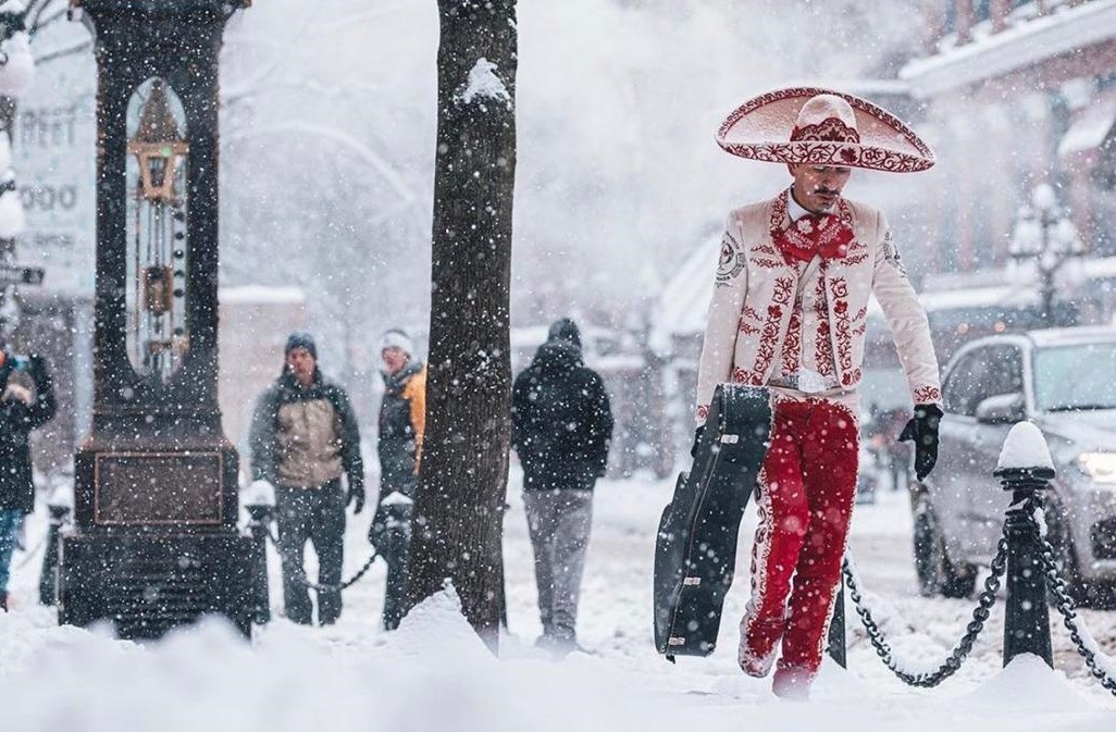 Canadá.- Orgullo, esfuerzo y sacrificio destacan en una fotografía que muestra a un músico mexicano enfundado en su traje típico de charro y cargando su instrumento debajo de una fuerte nevada y un clima extremo de menos 7 grados centígrados en Vancouver, Canadá, la imagen fue retomada como escudo por miles de mexicanos para dejarle saber al mundo entero que ¡no se saben rajar!