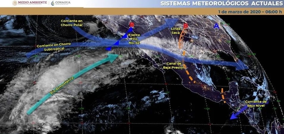 Para hoy, el frente frío No. 42 ingresará en el noroeste de México e interaccionará con un vórtice de núcleo frío en la atmósfera superior y con la humedad aportada por un río atmosférico, dando origen a la Décima Tormenta Invernal de la temporada sobre dicha región del país.
