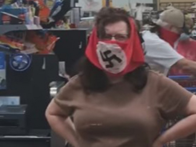 En redes sociales fue difundido un video que muestra a una pareja haciendo las compras en el supermercado usando cubrebocas con la bandera nazi.