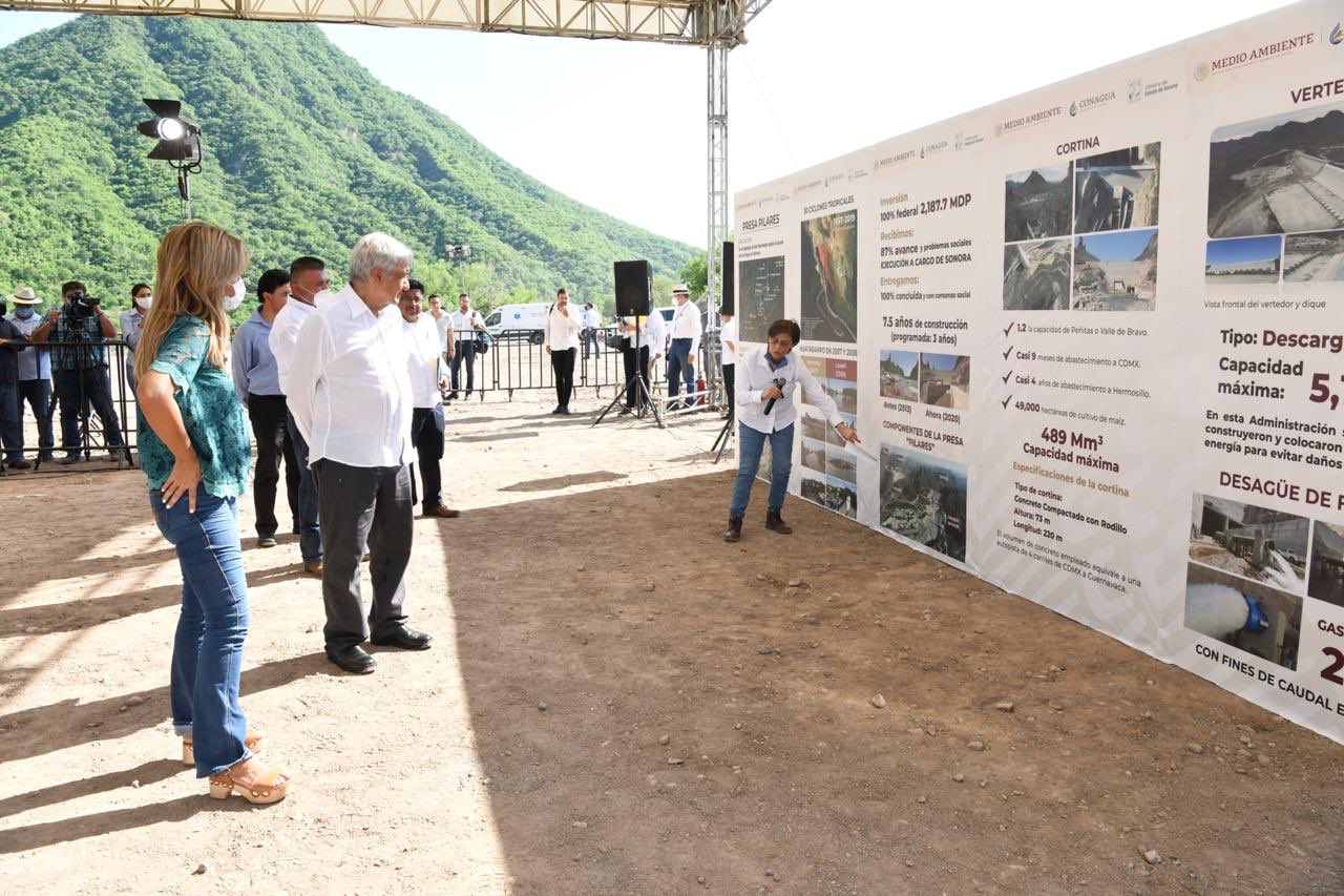 Álamos, Sonora, agosto 5 de 2020. Después de años de gestiones para la culminación de una obra muy esperada por los habitantes de los municipios de Navojoa, Etchojoa y Huatabampo, que permitirá el desfogue ordenado de excedentes de agua y con ello evitará inundaciones en la zona, el presidente de México, Andrés Manuel López Obrador y la gobernadora Claudia Pavlovich Arellano inauguraron la Presa Bicentenario Los Pilares.