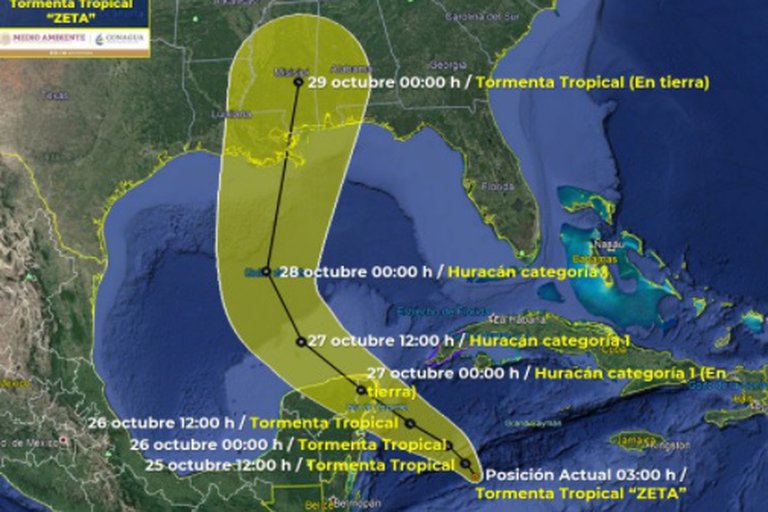 Aunque el pronóstico del Servicio Meteorológico Nacional (SMN) indicaba este sábado que el sistema avanzaría por las aguas del canal de Yucatán sin tocar tierra en México, ahora esta previsión cambió, y todo apunta a que el centro de Zeta impactará en el sureste del país en la tarde del lunes 26 de octubre.