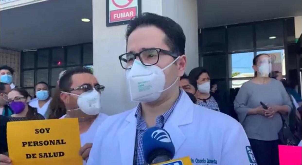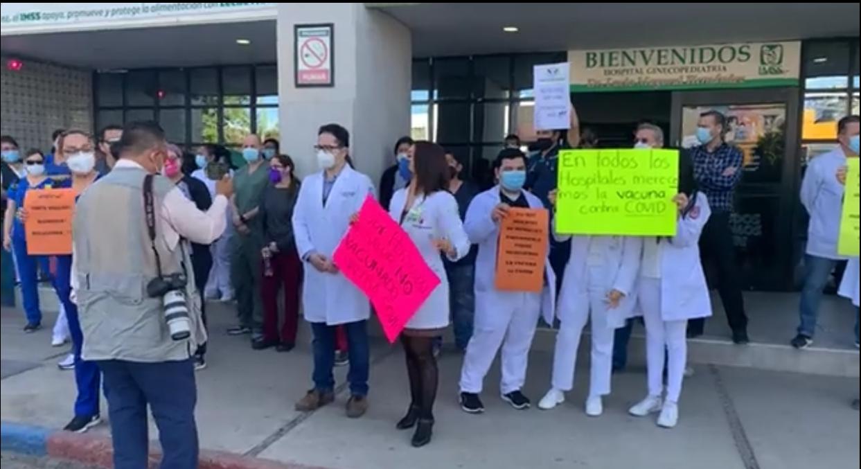 Personal médico, de enfermería, químicos y camilleros del Hospital de ginecopediatria del IMSS se manifestaron esta tarde para solicitar se les aplique la vacuna contra el covid.
