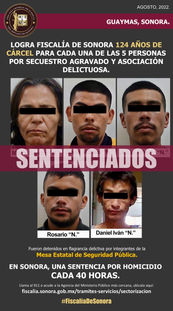 Cinco personas, una mujer y cuatro hombres, recibieron penas individuales de 124 años 3 meses de prisión y multa global de 8 millones 672 mil 635 pesos, por los delitos de secuestro agravado en número de dos y asociación delictuosa.