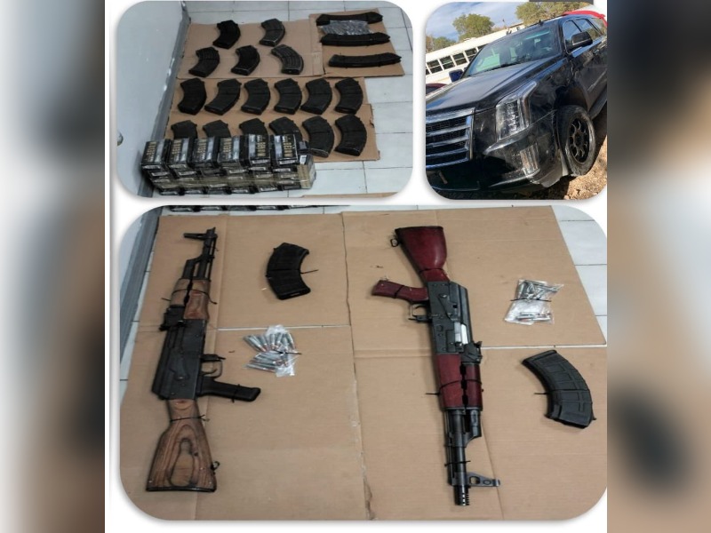 Reveló que se trata de un automóvil marca Cadillac, tipo Escalade, modelo 2017, color negro, sin placas; con reporte de robo en los Estados Unidos, que tenía en su interior dos armas de asalto tipo fusil, calibre 7.62 X 39 mm; 22 cargadores para arma de fuego calibre 7.62 X 39 mm; 714 cartuchos para arma de fuego calibre 7.62 x 39 mm.