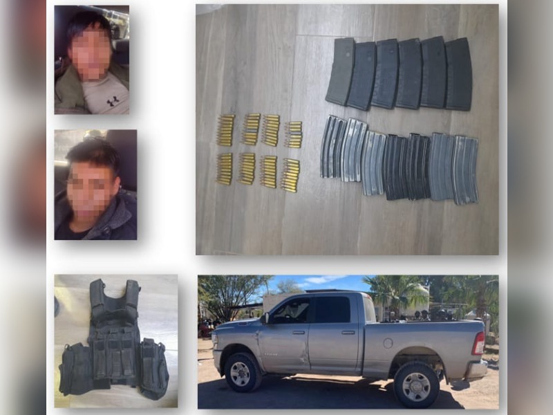 En Altar fueron arrestados Carlos Eduardo “N” y Brandon “N”, quienes a la altura del ejido Llano Blanco, fueron interceptados a bordo de un pick up y al momento de ser revisados les encontraron 13 cargadores y 78 cartuchos para calibre .223 y un chaleco porta cargadores color negro.