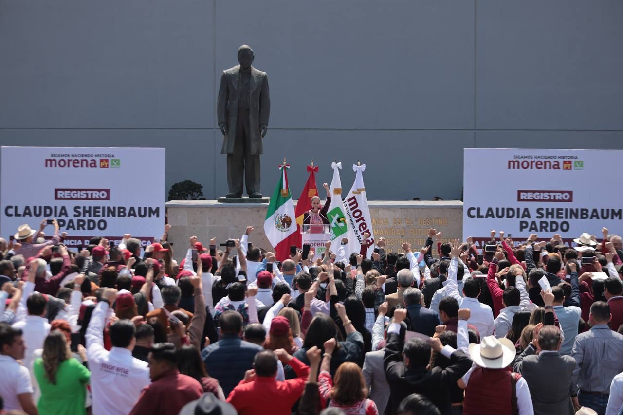 Claudia Sheinbaum se registró como candidata presidencial de Morena, PT y PVEM en medio de muestras de apoyo al grito de “la doctora al frente, la esperanza sí se siente” y carteles con leyendas que decían “amor con amor se paga” por parte de militantes; pero también arropada de los principales liderazgos del partido como Ricardo Monreal, Marcelo Ebrard, Gerardo Fernández Noroña, Manuel Velasco, que garantizan la unidad.