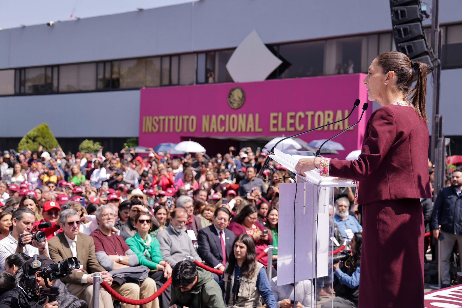 Afirmó que, en esa lucha, la democracia es una causa fundamental del movimiento y ante las puertas del INE, rememoró batallas históricas como la “no reelección”, hasta el “voto por voto, casilla por casilla” que fue símbolo de la 4T.